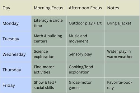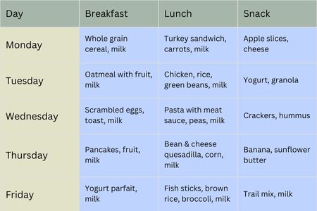 See planned meals and activities. Details may change slightly based on children’s needs and ingredient availability.